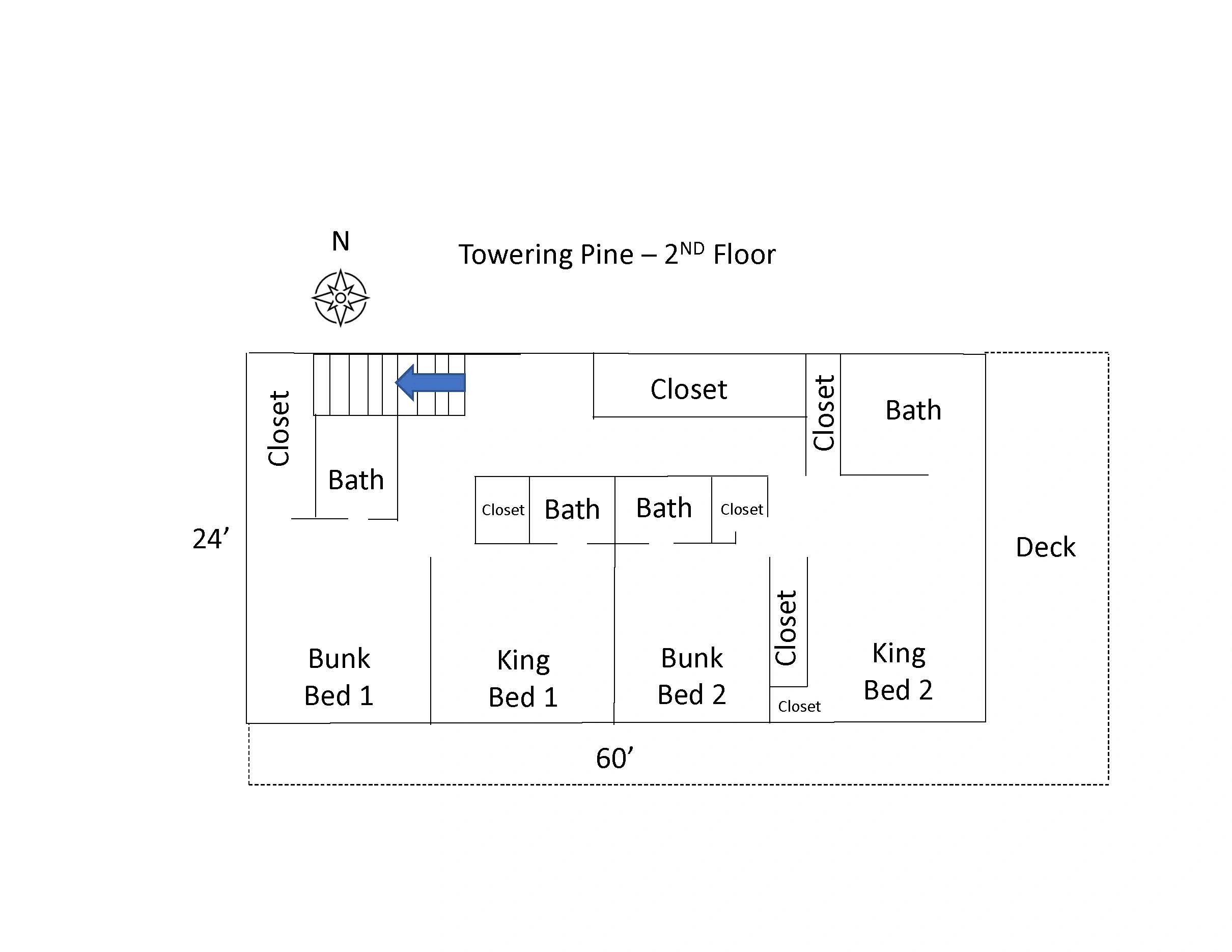 two rooms have king beds and two rooms have twin-over-queen bunk beds plus a second twin bed.